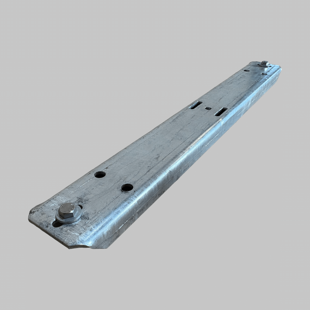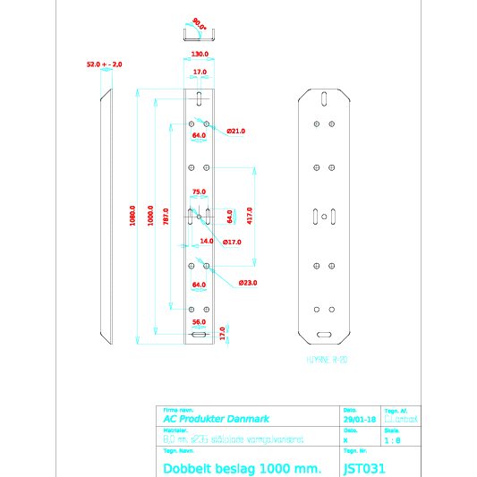 8,0 mm. stål med aflange huller. B=130 mm. Centerafstand til aflange huller på midten 75 mm. Bredde på aflange huller 14 mm. Galv.